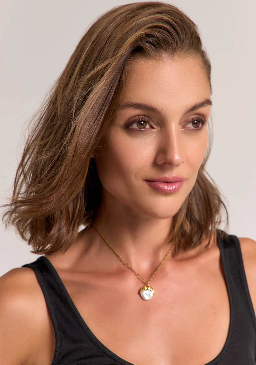 Vergoldete Halskette mit gedrehter Gliederkette und barockem Perlenanhänger. Die Perle ist von einer strukturierten Goldfassung umhüllt. Aus Edelstahl mit 18K Goldbeschichtung. Glänzendes Finish. Karabinerverschluss.