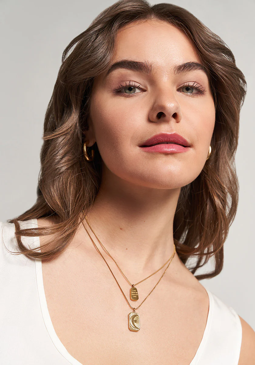 Diese kunstvoll gestaltete Halskette mit rechteckigem Anhänger und eingeprägtem Halbmond- und Sonnenrelief mit feinen Gravuren verleiht dem Schmuckstück einen Retro-Stil. Gefertigt aus korrosionsbeständigem Edelstahl 304 mit Vergoldung ist er nicht nur widerstandsfähig gegen Kratzer und Abnutzung, sondern auch hypoallergen und hautfreundlich.