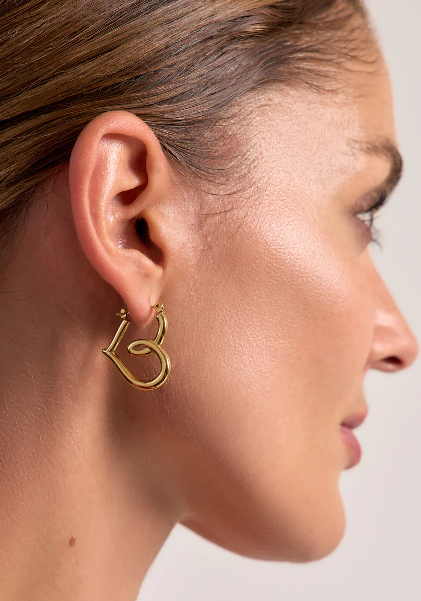 Goldfarbene Creolen in stilisierter Herzform aus Edelstahl. 18K Goldbeschichtung und mit Klappverschluss.