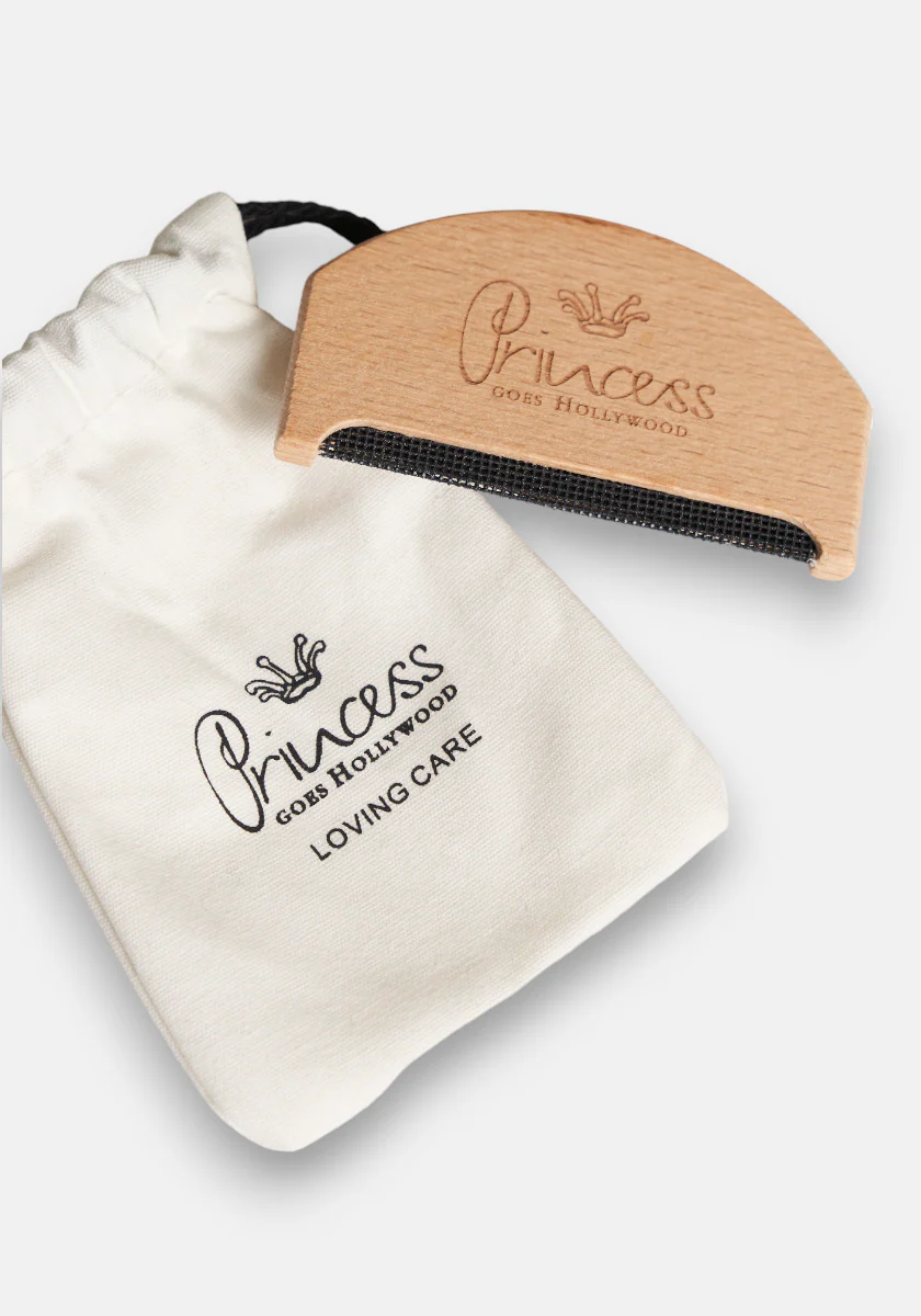 Kaschmirkamm von Princess Goes Hollywood aus Buchenholz im edlen Säckchen aus Baumwolle. Handlich und praktisch zum Entfernen von Faserknötchen bzw. Pilling auf Pullovern, Schals oder Cardigans u.ä. In halbrunder Form und Princess-Goes-Hollywood-Schriftzug. Masse ca. 10.5 x 8 cm.