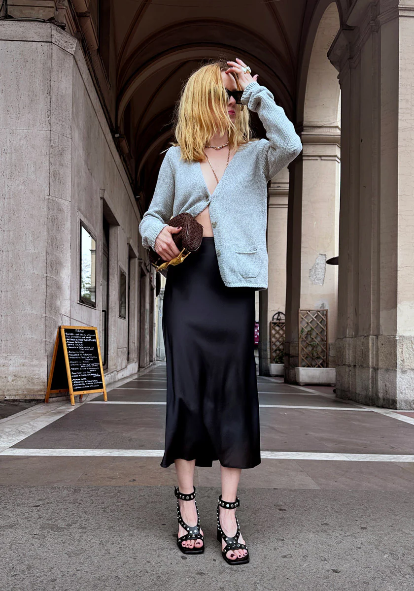 Basic Midirock aus Seide mit Stretchanteil und elastischer Taille.
