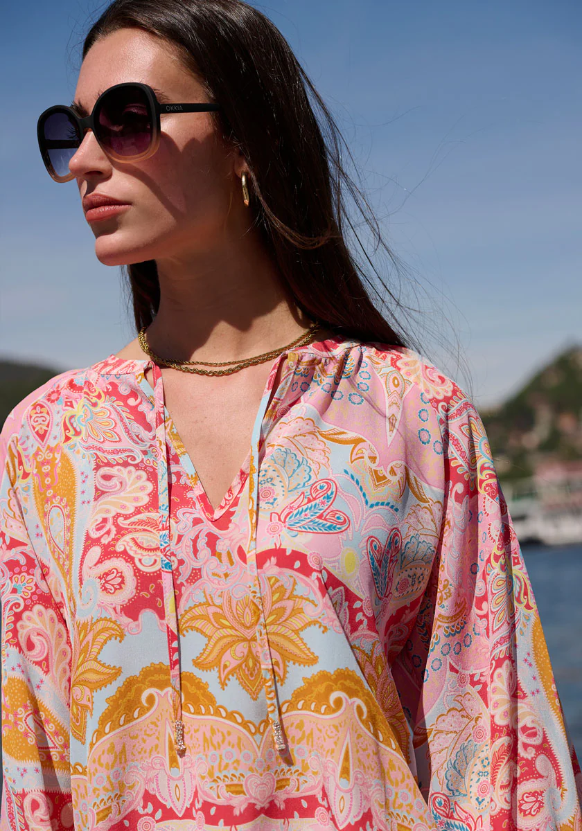 Fliessende Bluse aus reiner Seide mit V-Ausschnitt und Bindebändern. Lange Ballonärmel mit Smok-Bündchen. Allover-Print.
