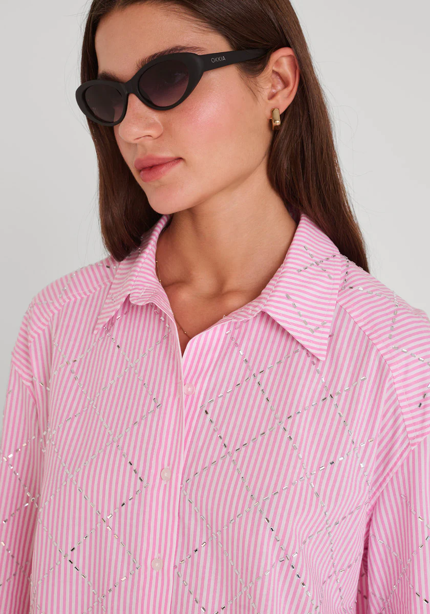 Gestreifte Hemdbluse aus 100% Baumwolle mit Hemdkragen und langen Ärmeln mit Knopfverschluss. Knopfleiste. Karomuster mit dekorativen Steinen. Abgerundeter Saum.