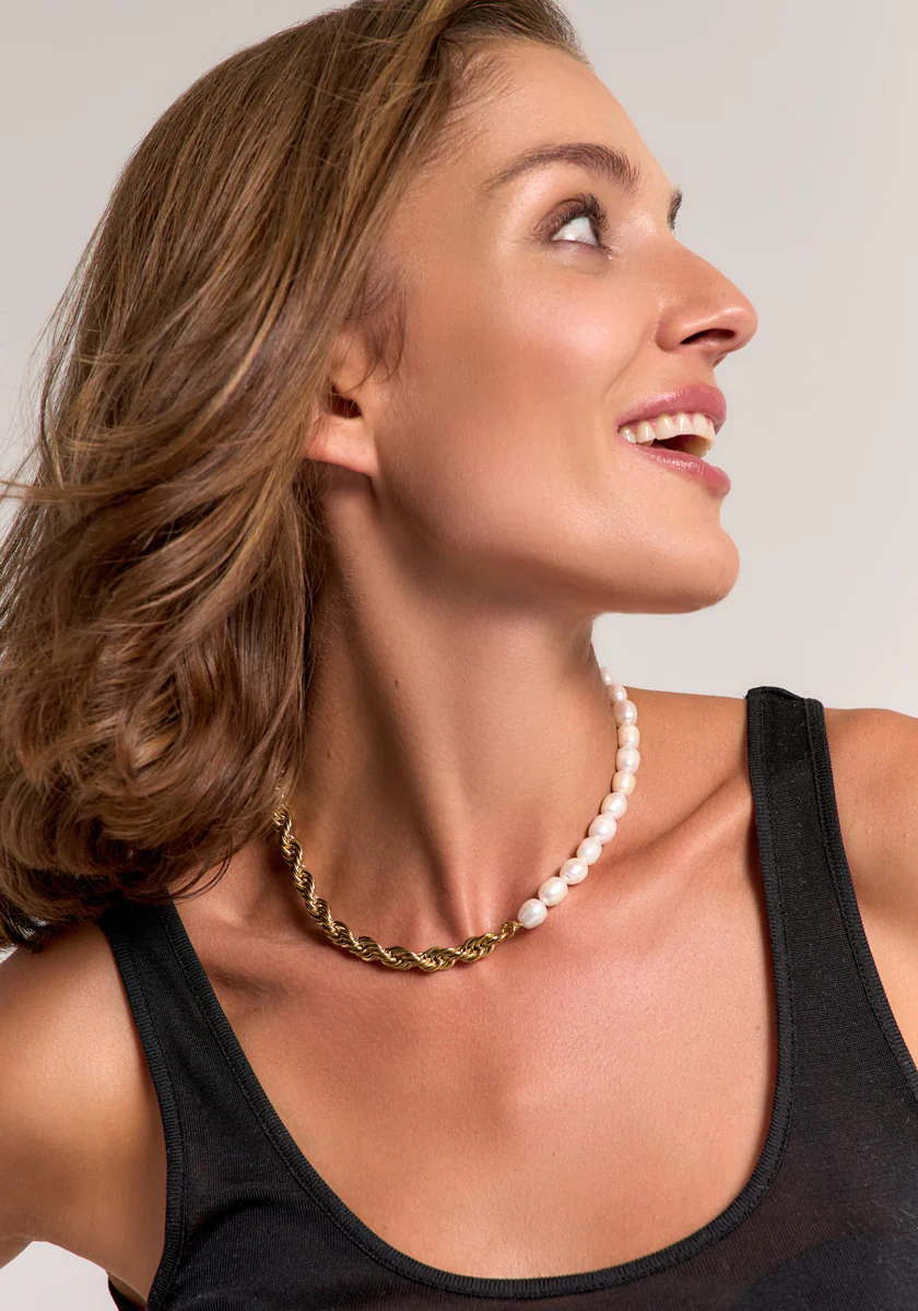 Halskette im kontrastierenden Mix aus gedrehter Gliederkette und unregelmässig geformten Süsswasserperlen. Aus Edelstahl mit 18K Goldbeschichtung. Verstellbare Länge mit Karabinerverschluss.